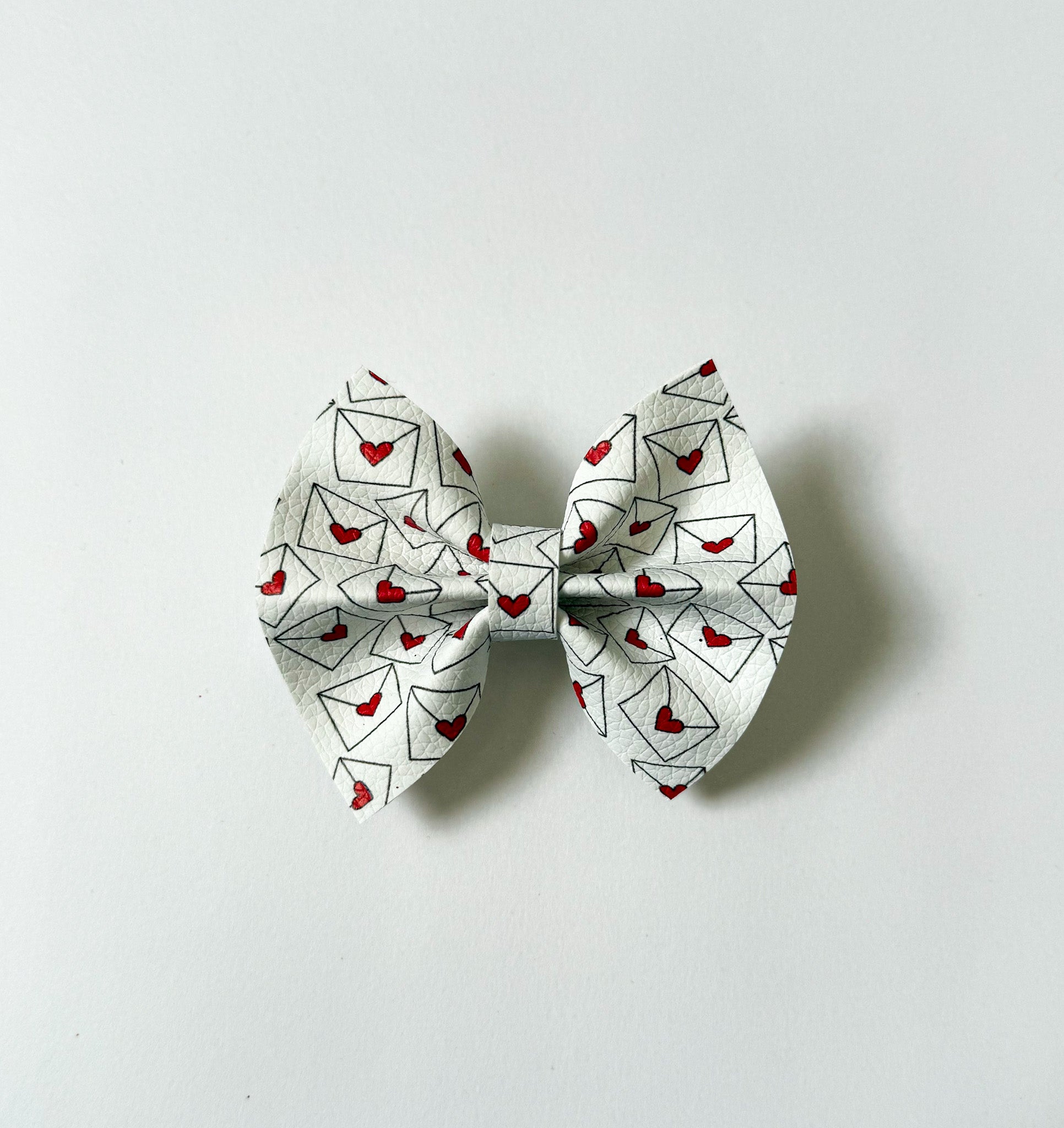 A timeless bow featuring tiny red hearts and black envelopes on a white faux leather in our Classic XL bow style. The perfect addition for Valentine's Day festivities!
