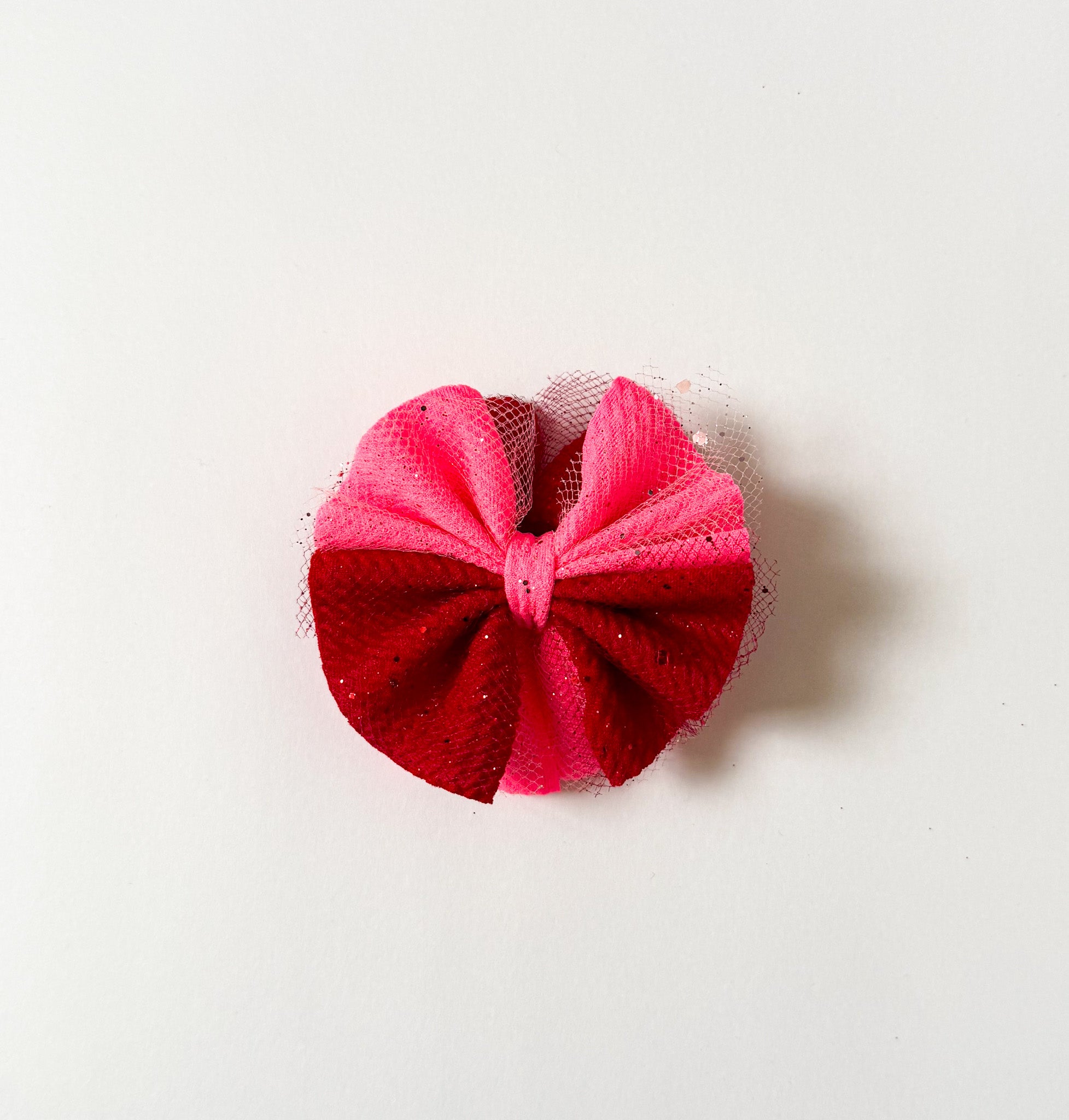 A super soft and super cute shredded bow featuring hot pink and red bullet fabric and coordinating hot pink and red sparkle tulle overlays. The perfect addition for Valentine's Day festivities!