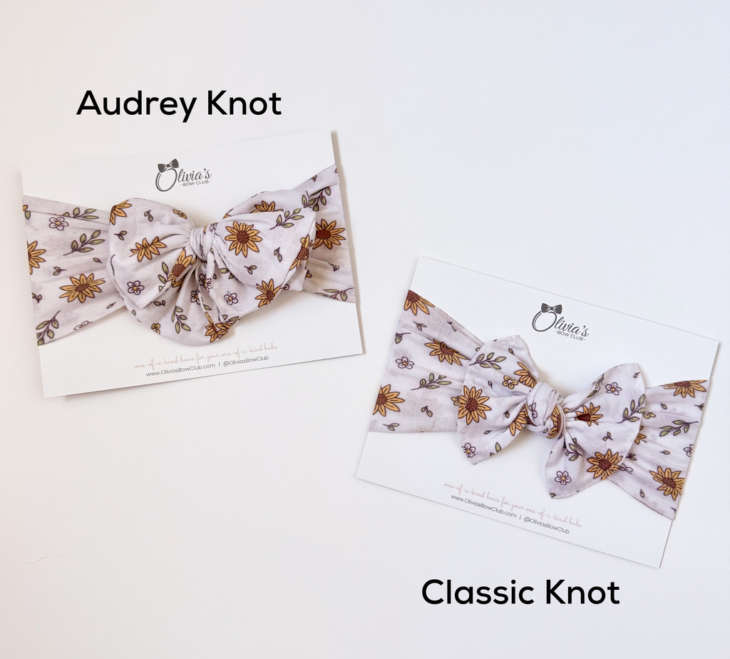 Our Most Loved Style! The Audrey Knot is a bigger style for our big bow lovers! This style has never been available for individual purchase as part of our subscription but now IT IS! This bow is made with buttery soft nylon and stretches to grow with your babe!