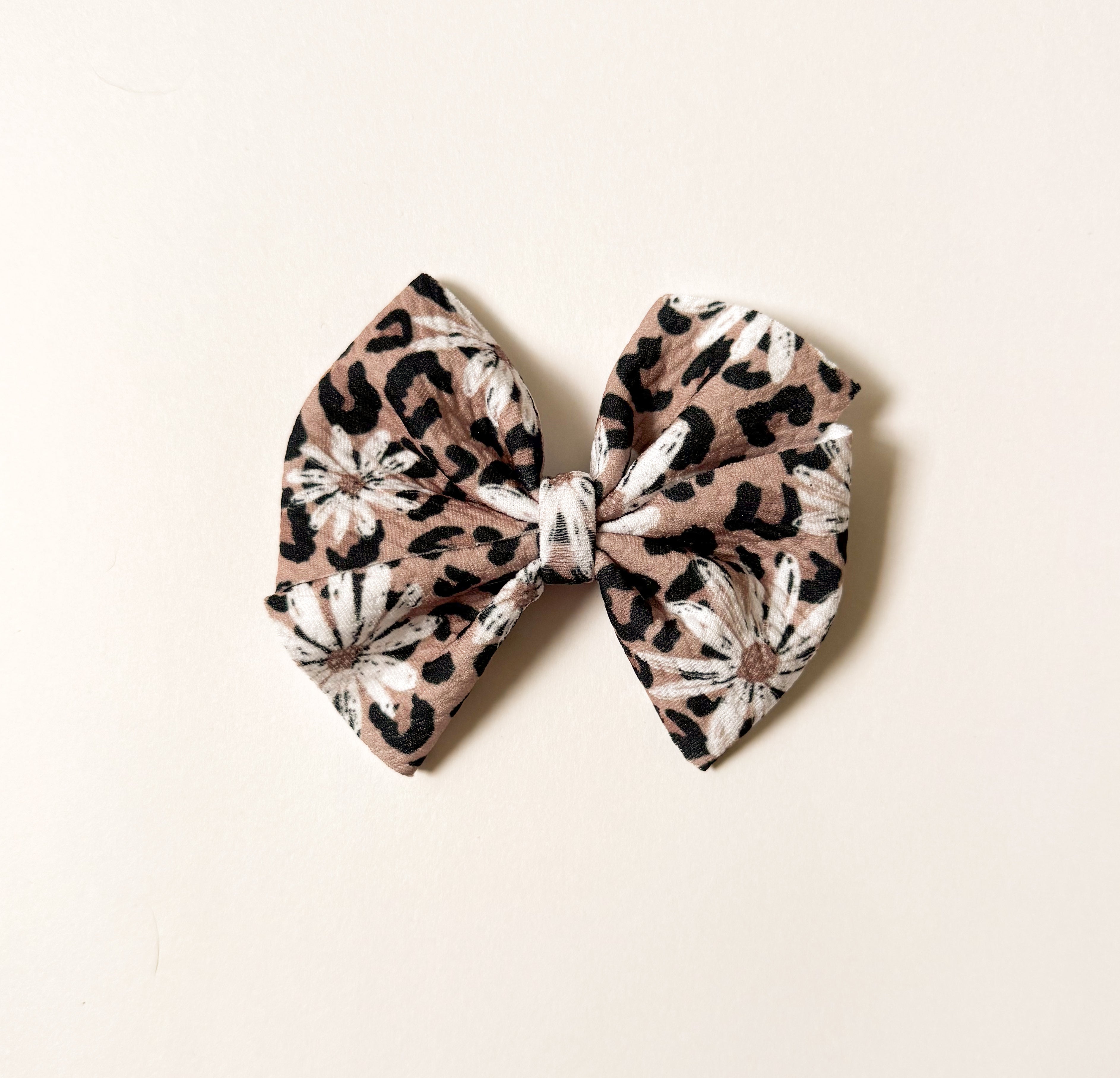 A fierce mix of leopard spots and soft white daisies in a fun pinwheel style bow.