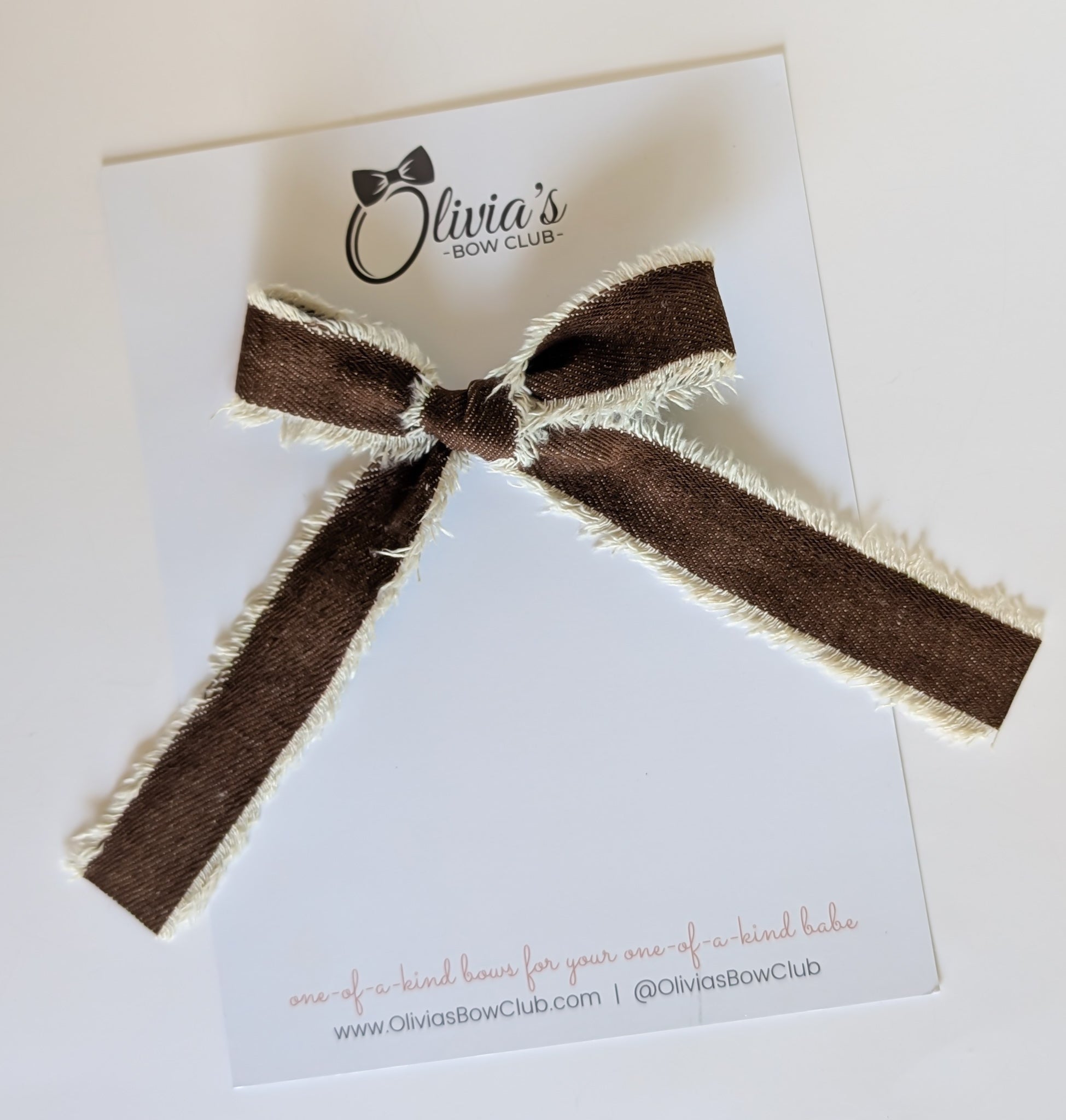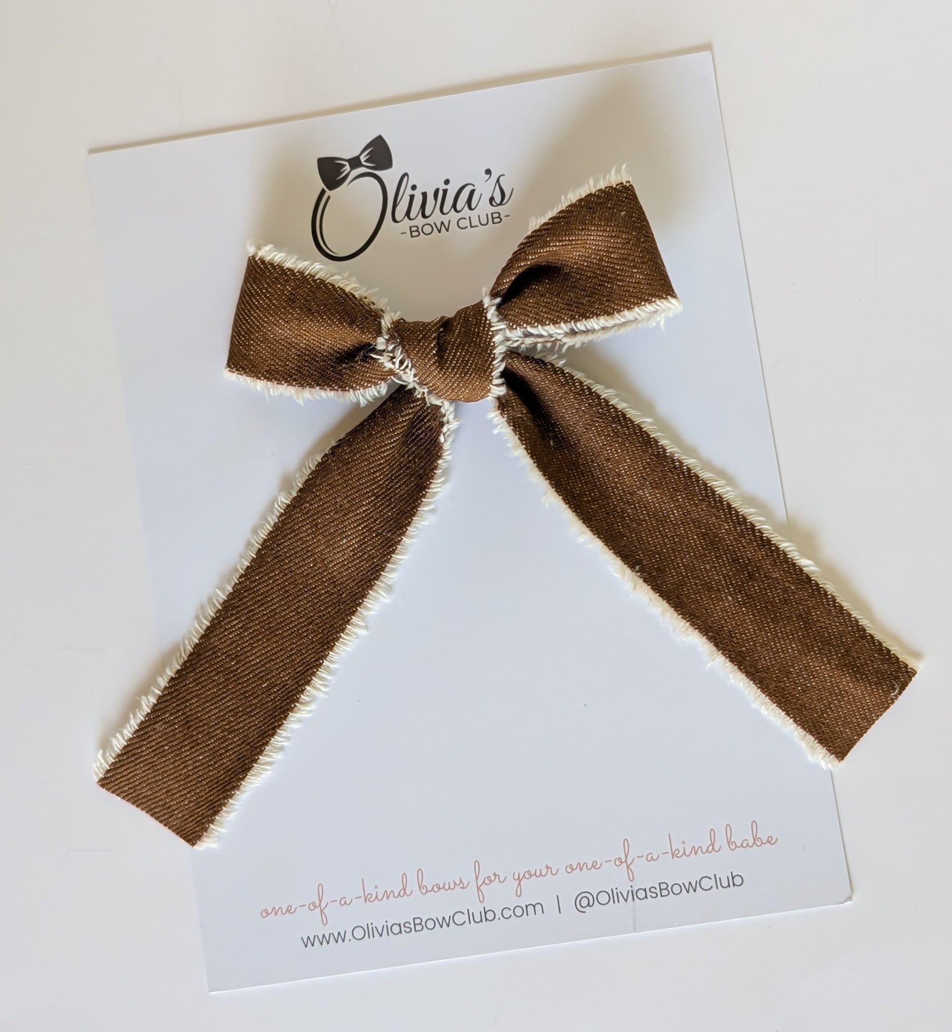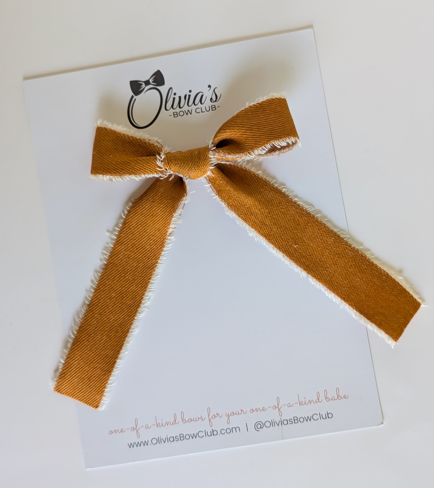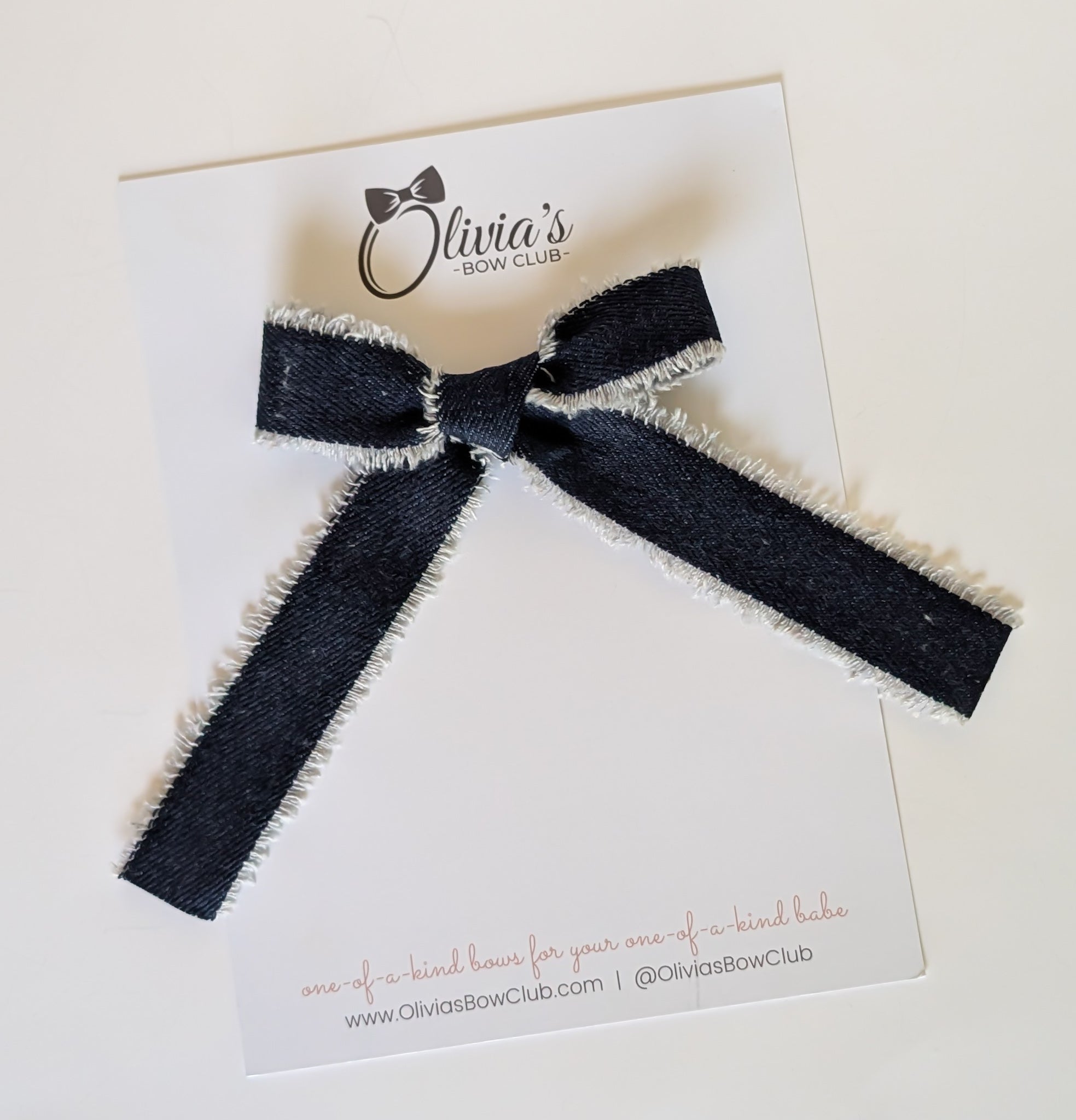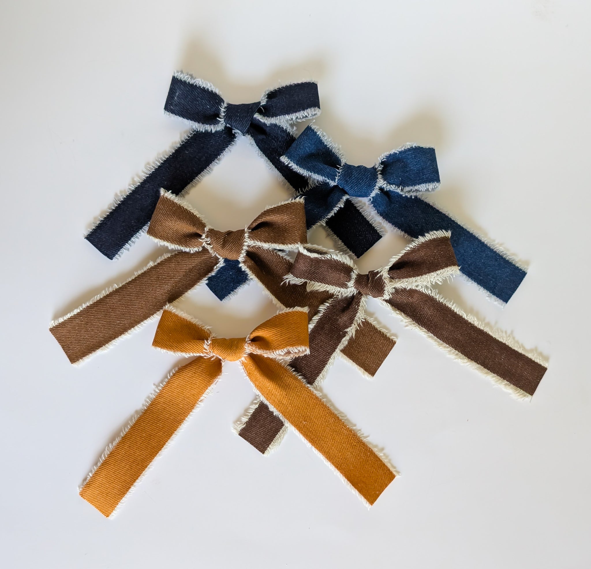 Step into timeless style with our Denim 'Dorable Collection! These bows are designed to blend chic denim charm with playful sophistication, perfect for everyday wear or special occasions. Each bow is hand-crafted with frayed edges for a rustic, yet polished finish that brings out the natural texture of the denim. Available in rich hues that complement any outfit, these bows are the perfect accessory for your little one.