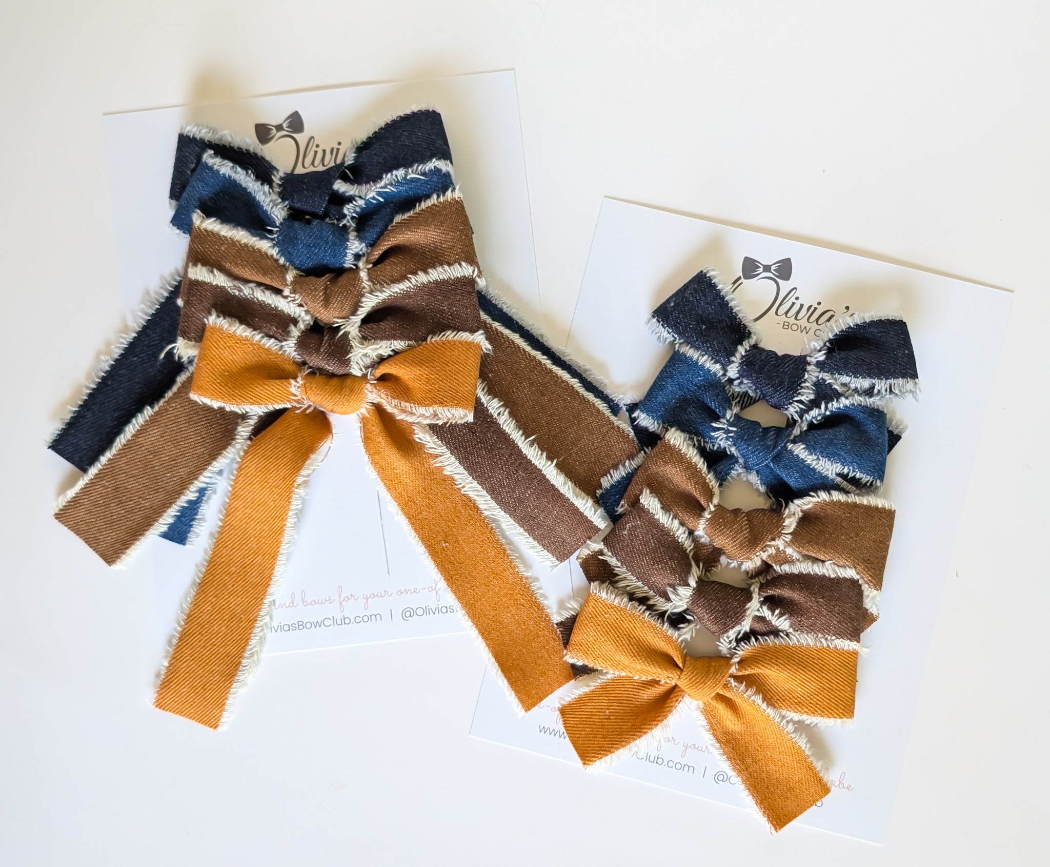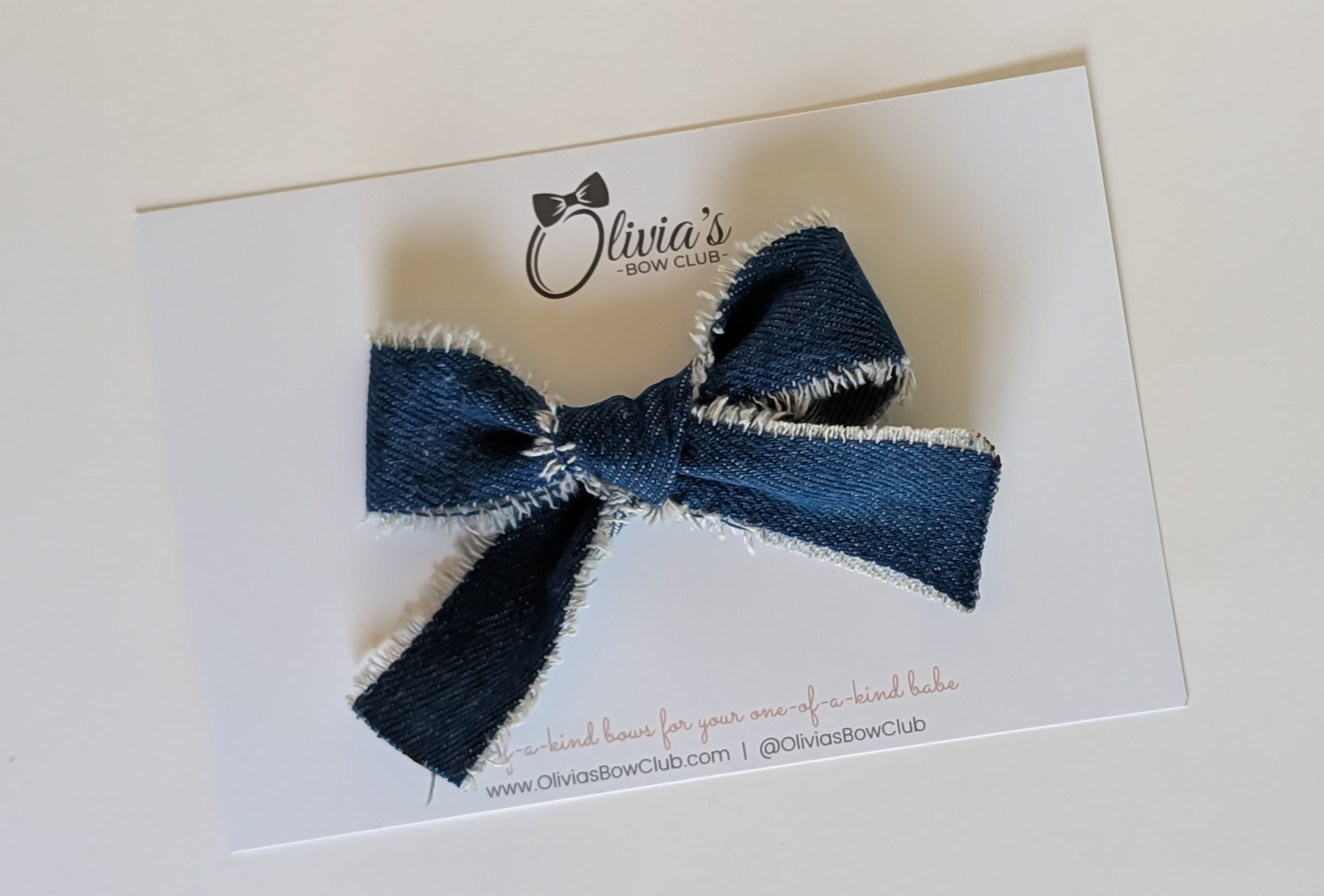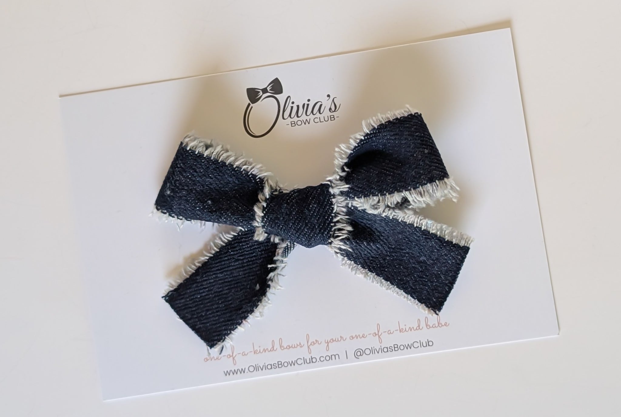 Step into timeless style with our Denim 'Dorable Collection! These bows are designed to blend chic denim charm with playful sophistication, perfect for everyday wear or special occasions. Each bow is hand-crafted with frayed edges for a rustic, yet polished finish that brings out the natural texture of the denim. Available in rich hues that complement any outfit, these bows are the perfect accessory for your little one.