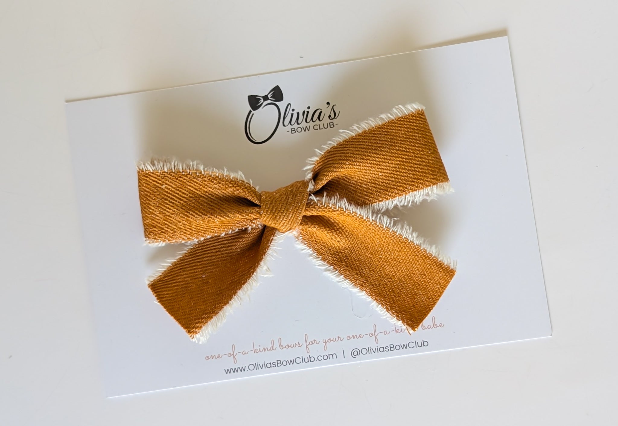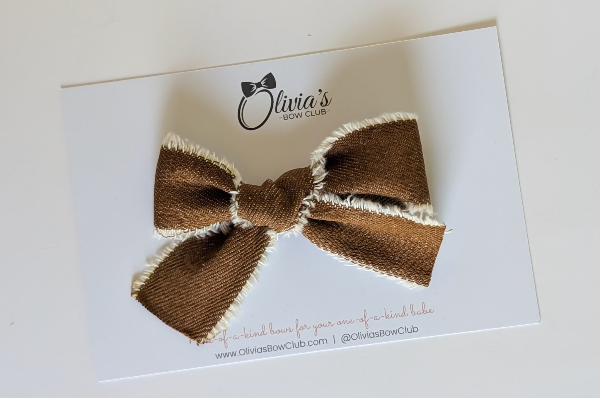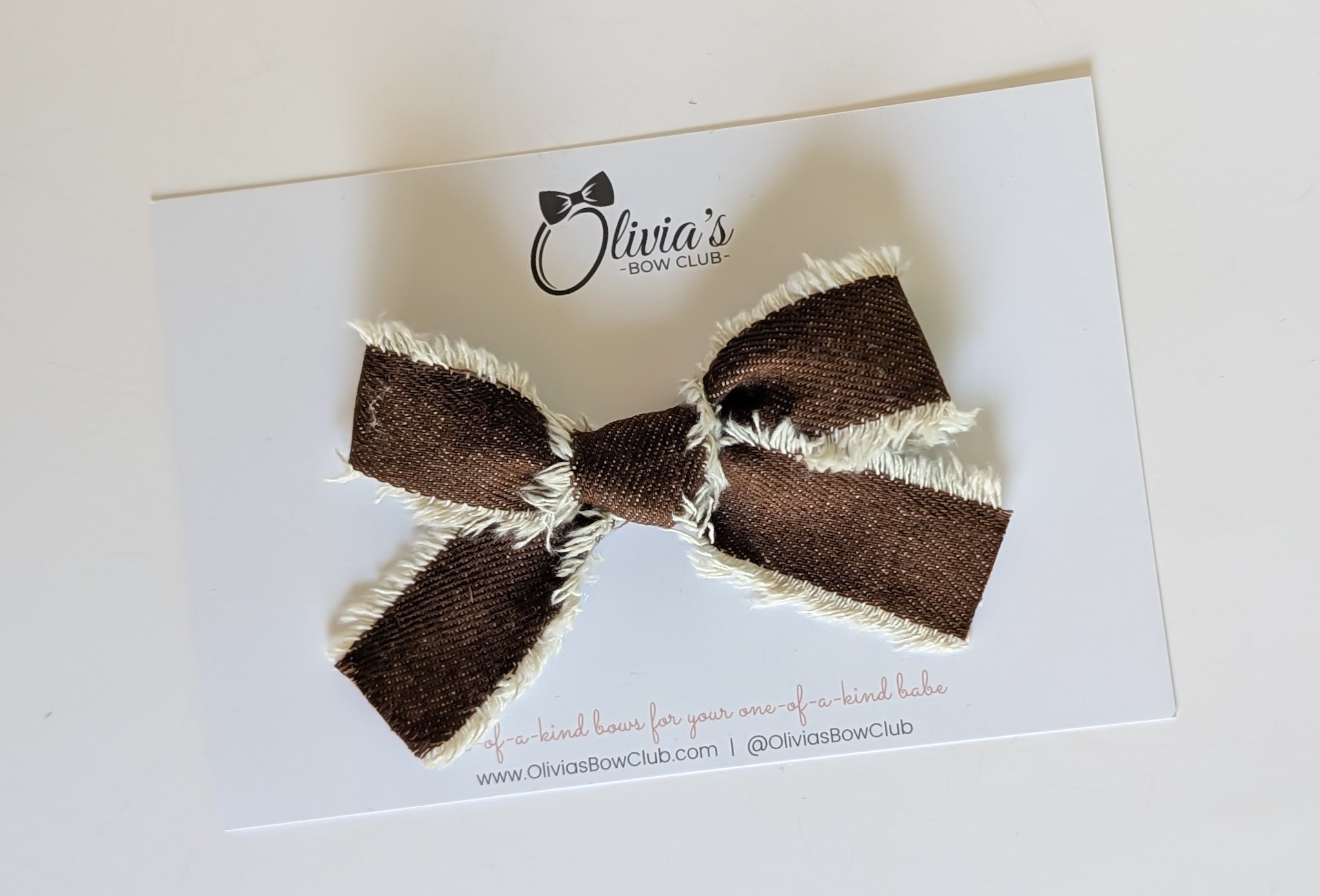 Step into timeless style with our Denim 'Dorable Collection! These bows are designed to blend chic denim charm with playful sophistication, perfect for everyday wear or special occasions. Each bow is hand-crafted with frayed edges for a rustic, yet polished finish that brings out the natural texture of the denim. Available in rich hues that complement any outfit, these bows are the perfect accessory for your little one.