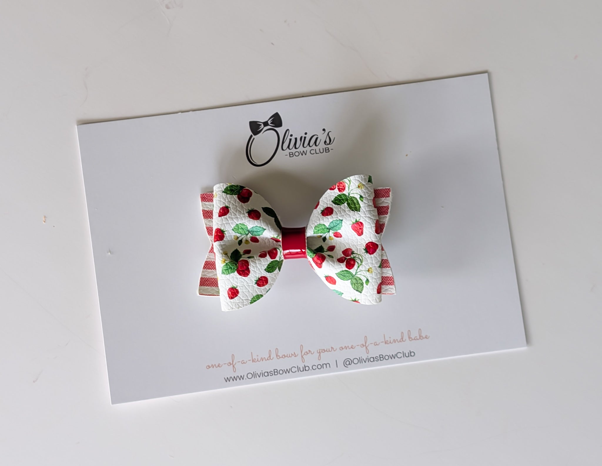 Bright, fresh, and full of charm — Freshly Picked is the sweetest way to celebrate sunny days! This darling bow features a playful mix of strawberries and soft pink gingham, topped off with a glossy red center for a little extra pop. 🍓✨