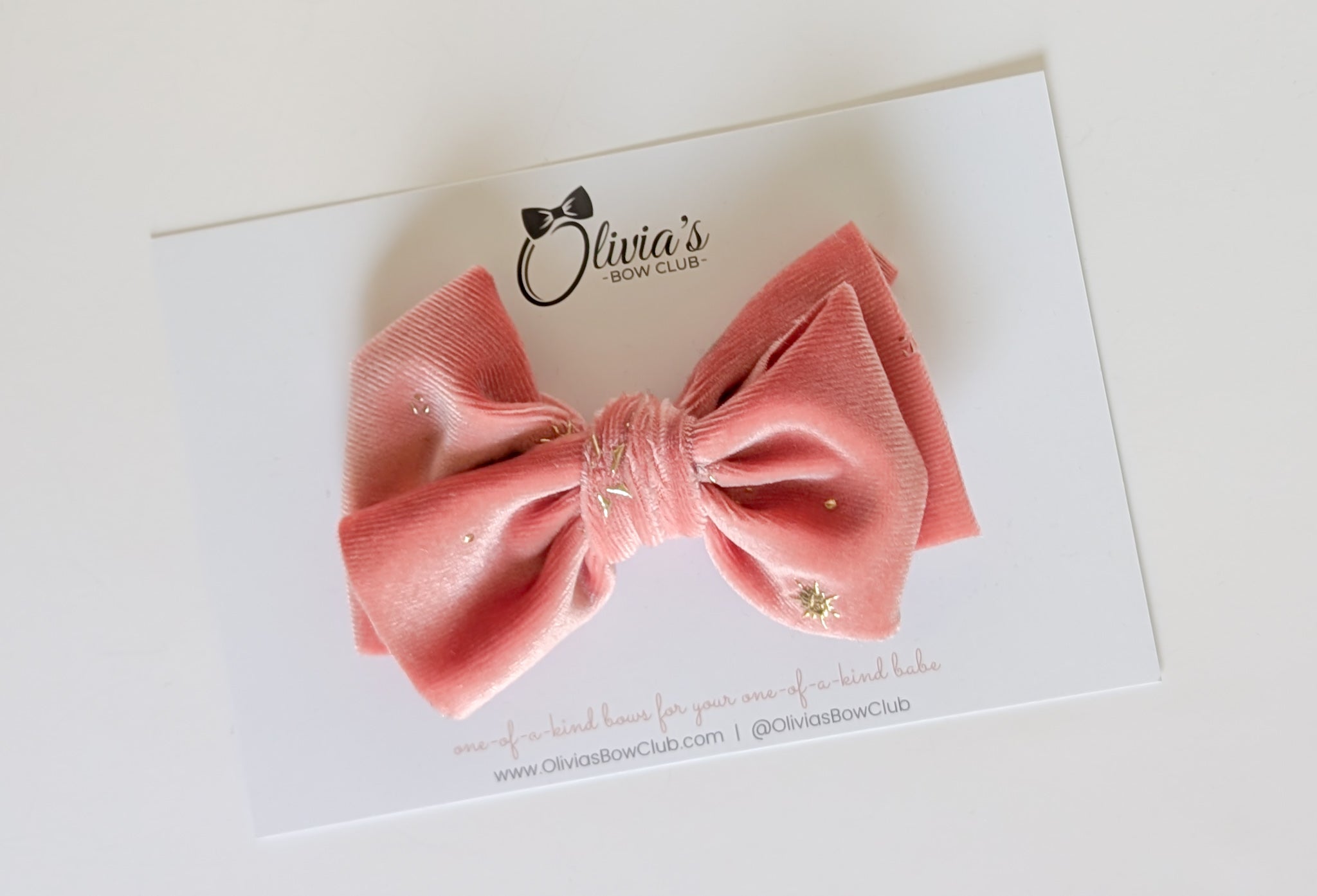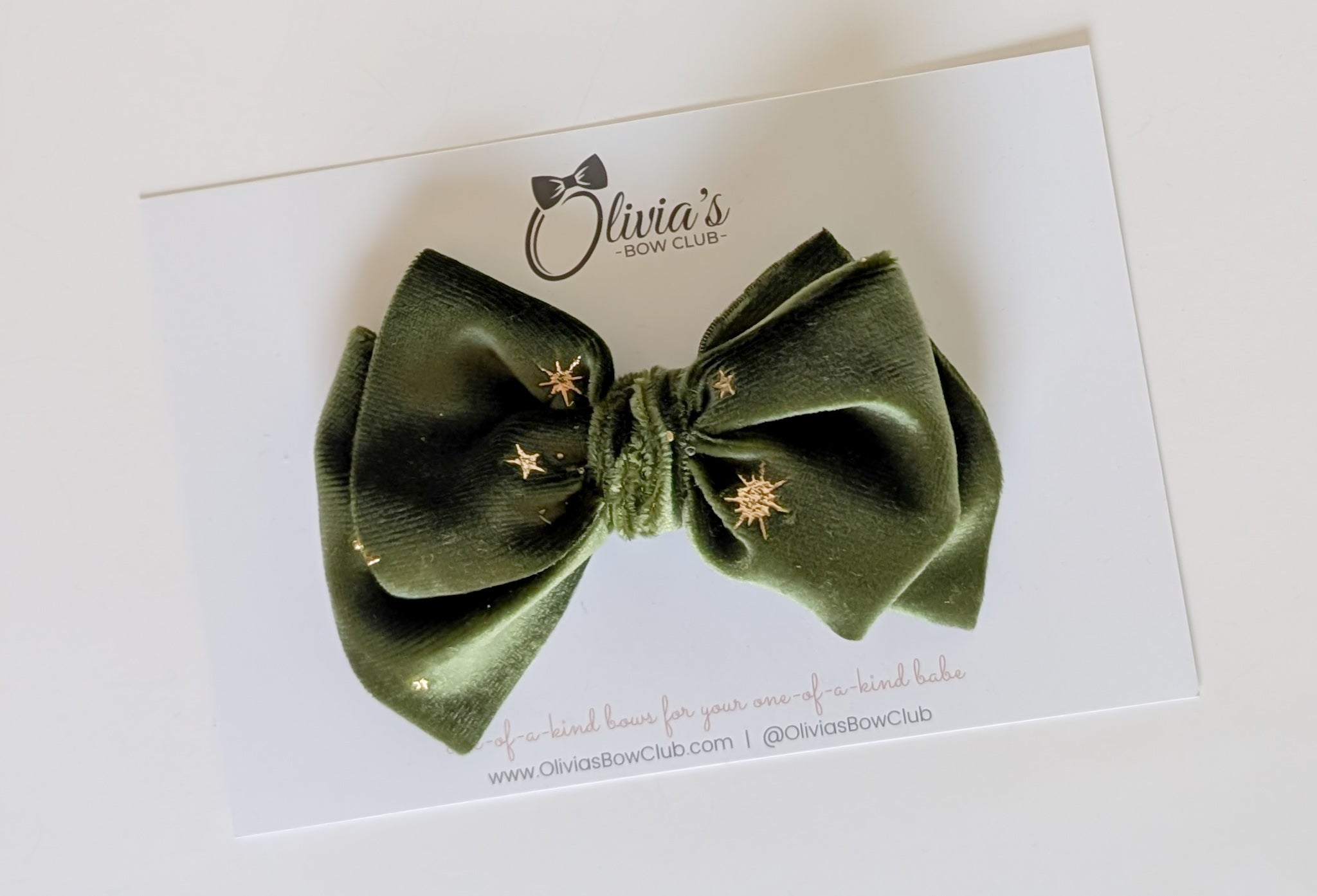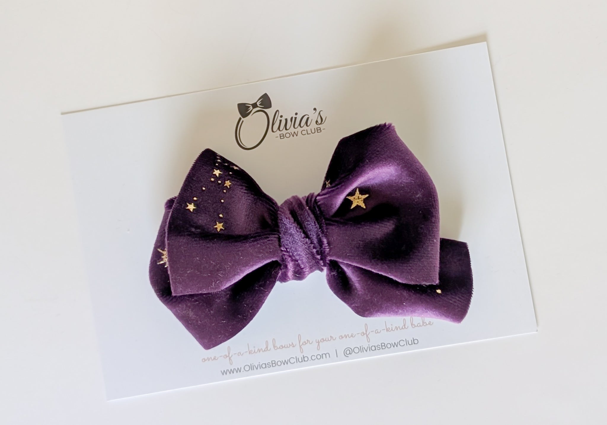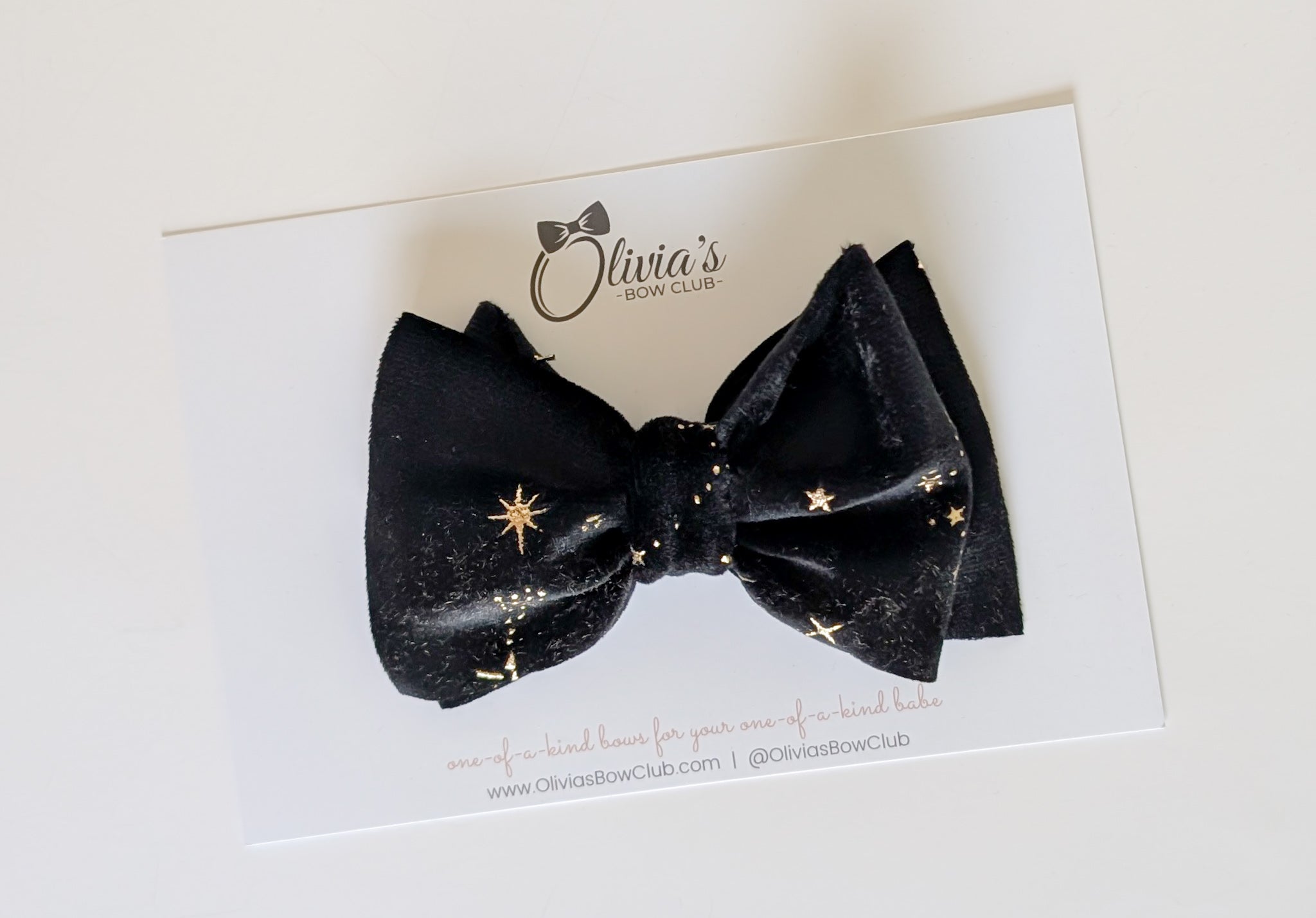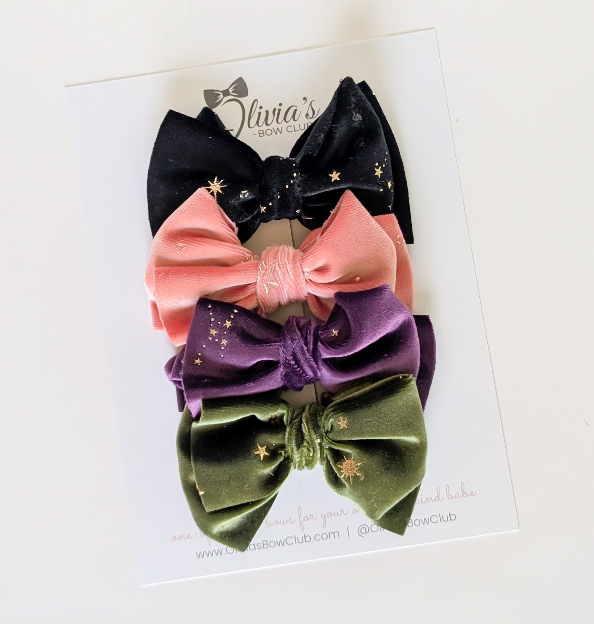 Discover the magic of the night sky with our Velvet Eclipse Collection. Each bow is crafted from luxurious velvet and adorned with delicate gold constellations, perfect for adding a touch of celestial elegance to your little one's outfits. Available in four dreamy colors—Midnight Black, Blush Pink, Twilight Purple, and Forest Green—these bows are designed to make your star shine bright. Whether dressing up or keeping it casual, our constellation bows will elevate any look with their unique, whimsical charm.