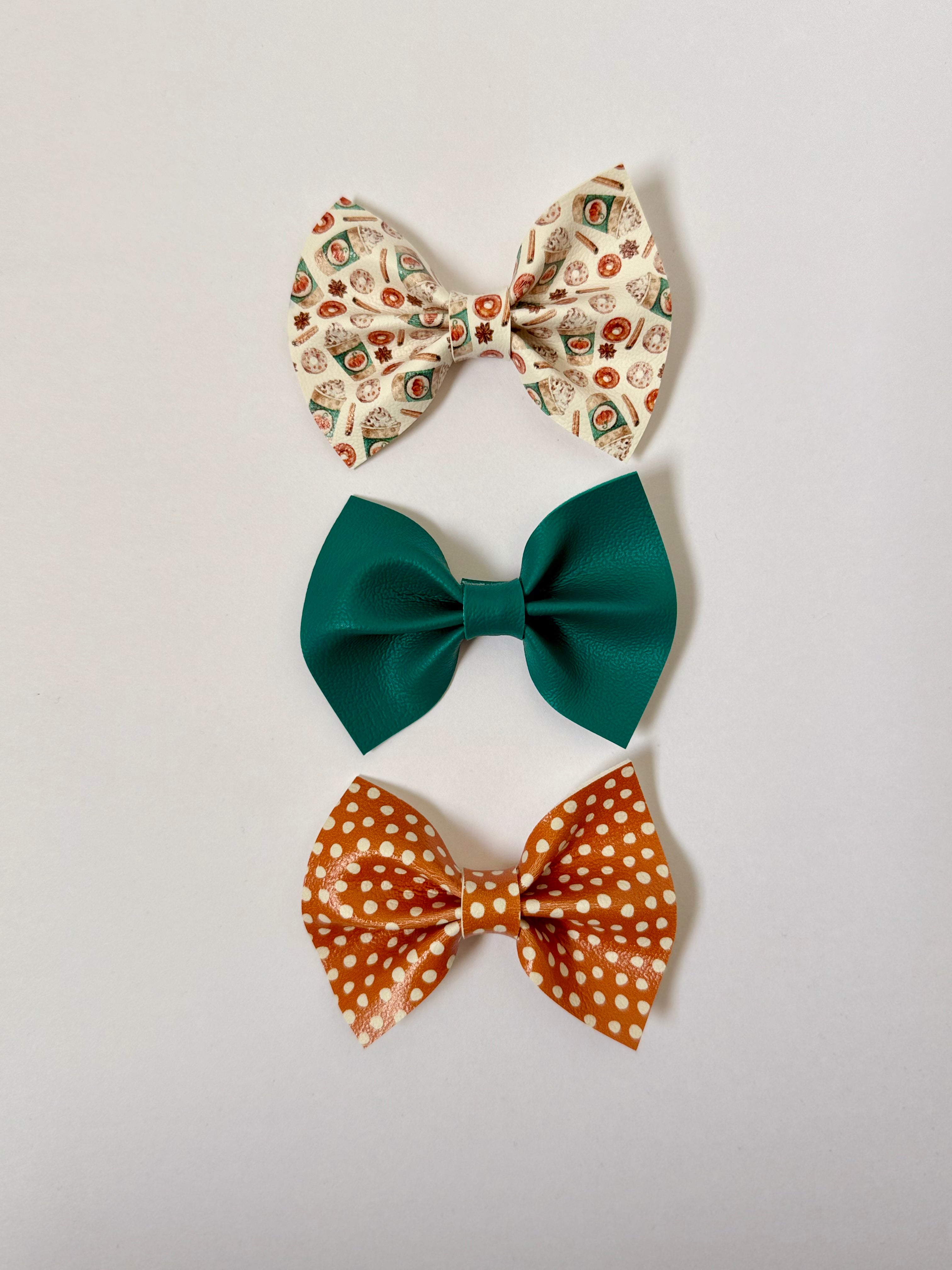 Kick off the fall season in rich textures and autumn tones with our Fall Coffee Set Leathers. Perfect for crazy mornings, cider runs, and everything in between. Each bow is handcrafted with care, using high-quality faux leather and seasonal prints.