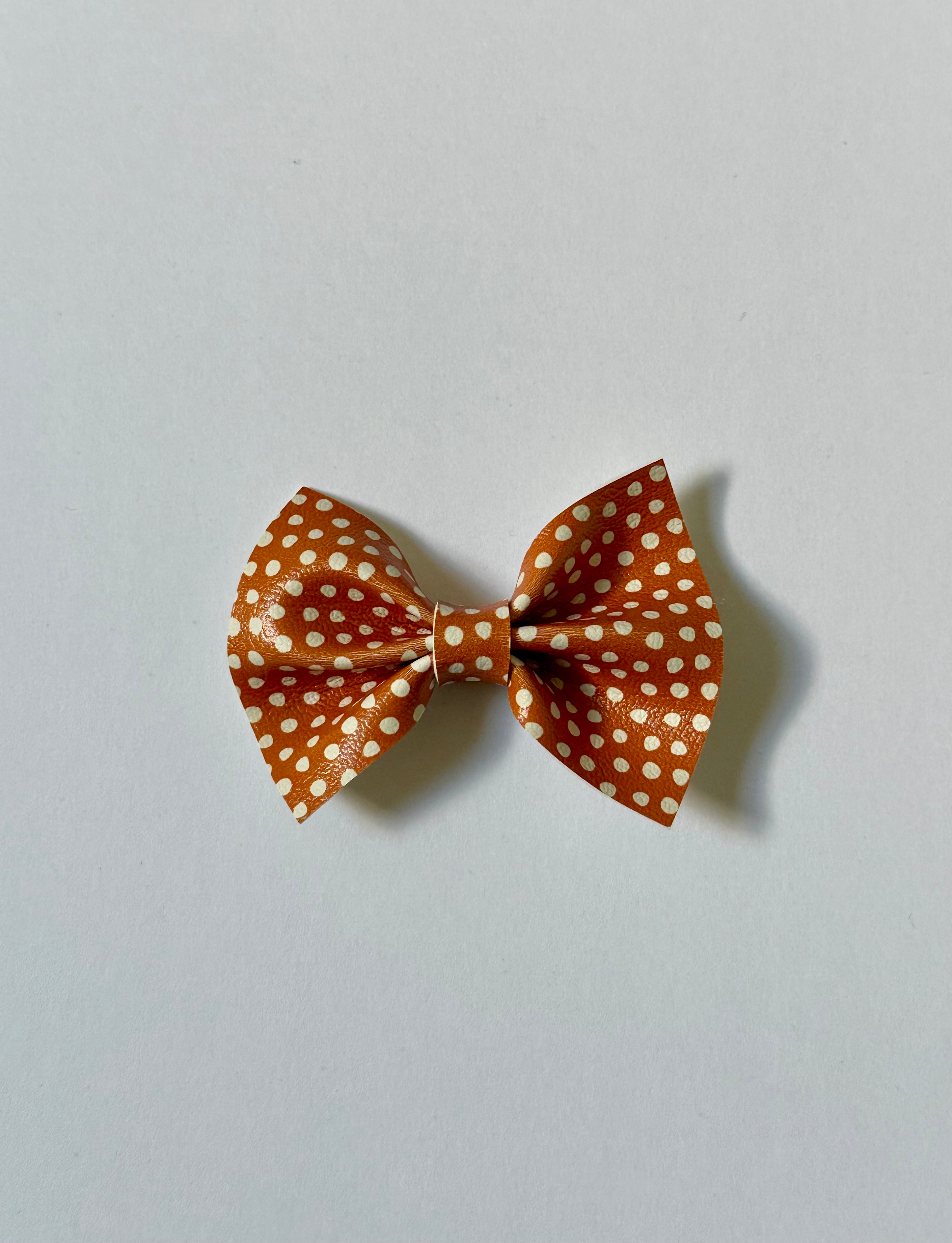 🧡 Harvest Dots – A burnt orange classic with playful ivory polka dots. Bold, festive, and full of pumpkin patch energy, this bow is your go-to for seasonal fun.