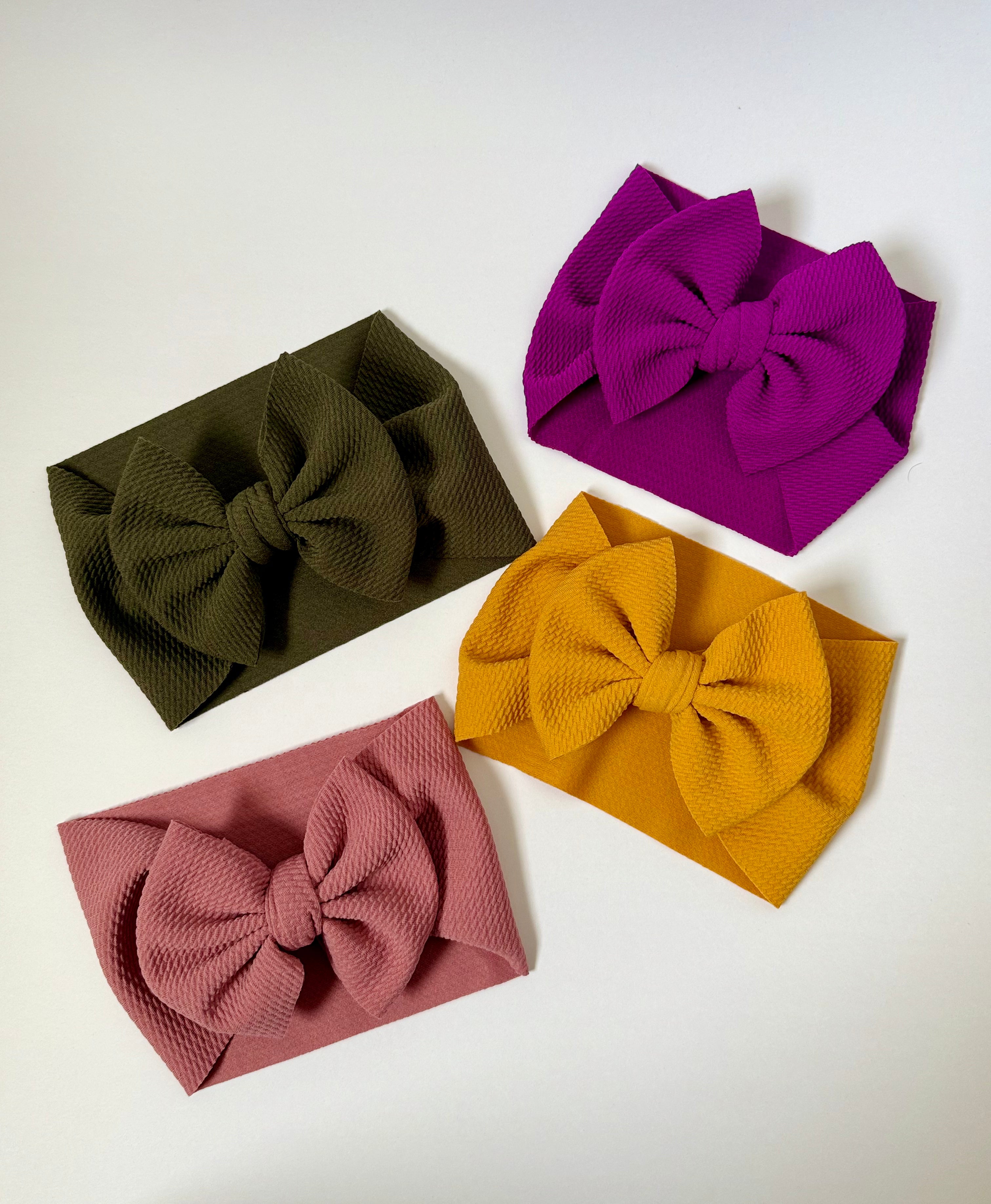 These big bows are here to make a statement. The Fall Solids Headwrap Set features four of our favorite fall shades. They're bold, pretty, and totally wearable. Soft, stretchy, and comfy for all-day wear (even for the picky ones). Note: These are made for babies ~3-9 months (head circumference approx 15").