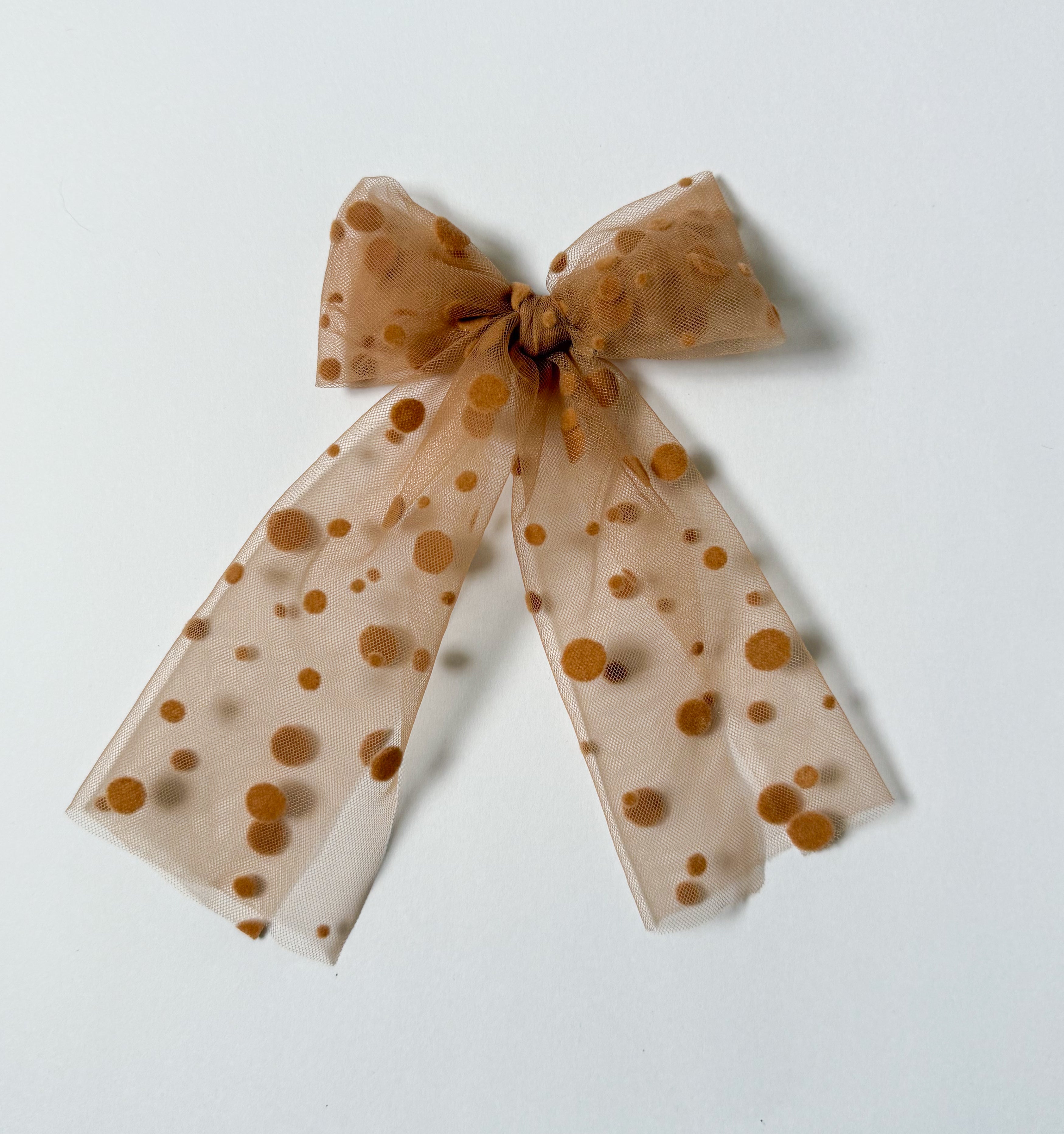 Latte: A warm honey-brown silky tulle with soft velvet dots, hand tied in our classic Genevieve style bow. Perfect for our fall lovers!
