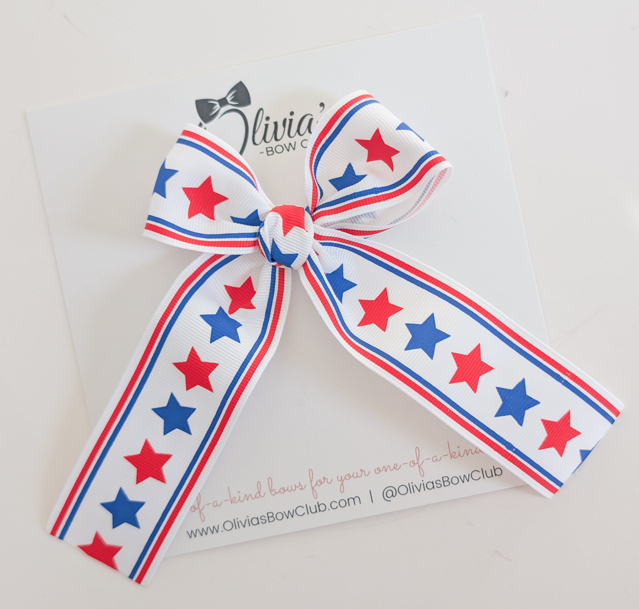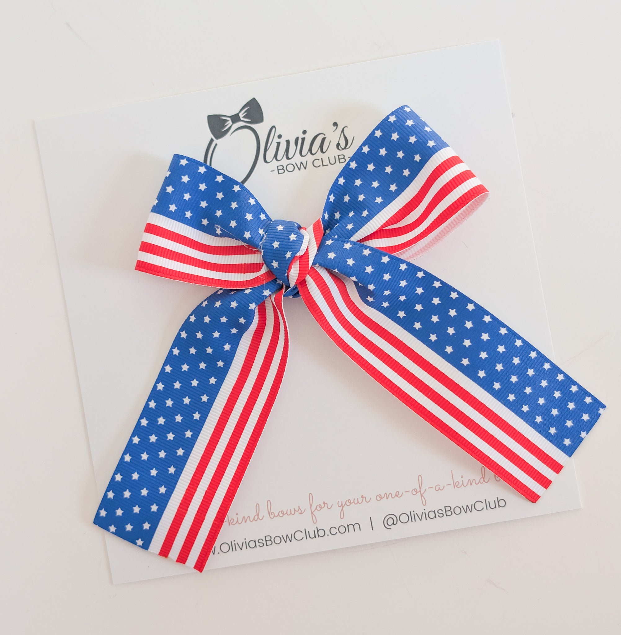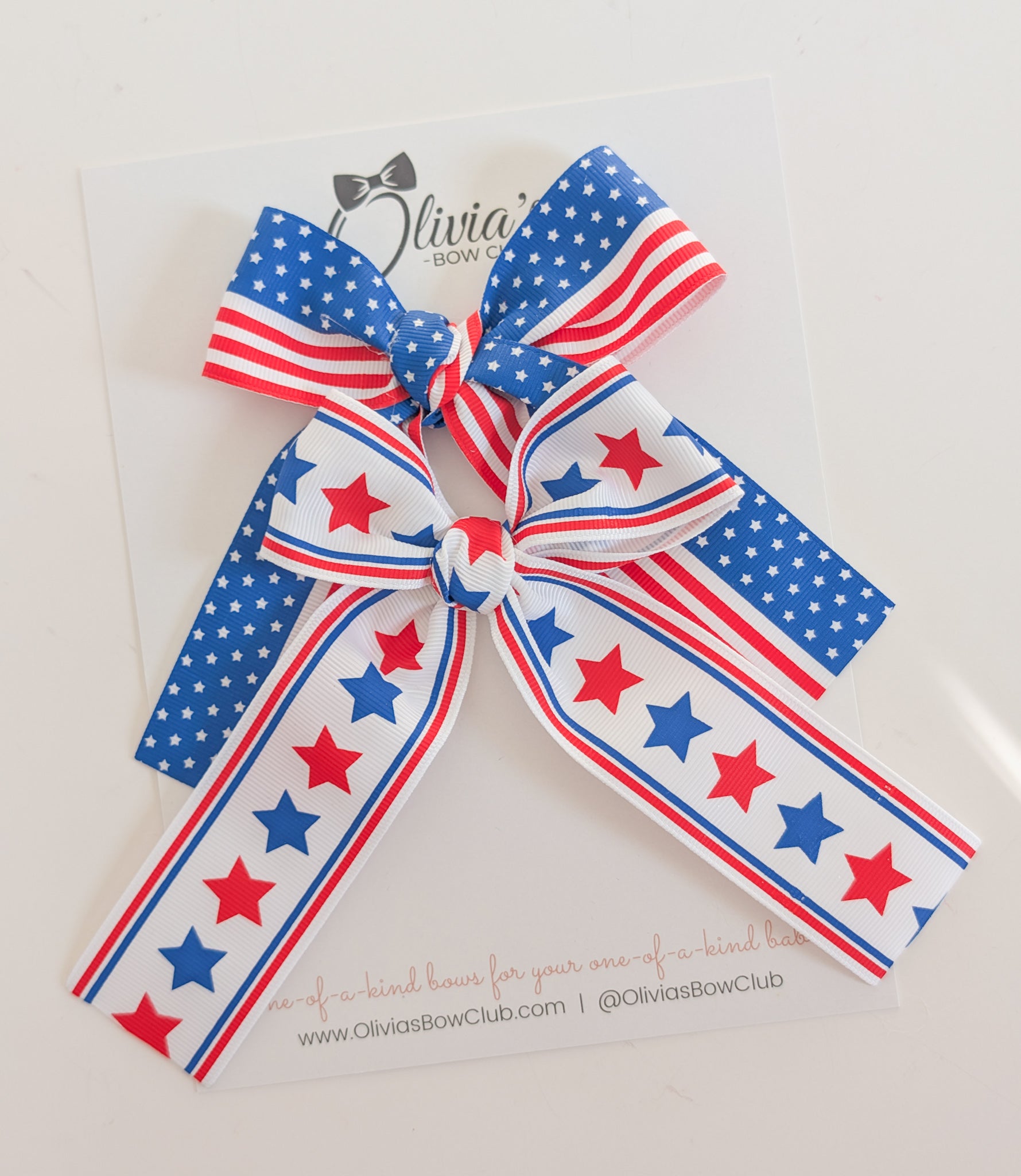 🎀 Patriot Parade – Classic and confident, this long-tailed style shines with split-pattern ribbons and a sweet knotted center. It’s made for twirls, snapshots, and all the summer fun.